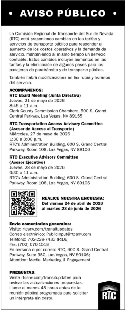 La Comisión Regional de Transporte del Sur de Nevada (RTC) está proponiendo cambios en las tarifas y servicios de transporte público para responder al aumento de los costos operativos y la demanda de servicio, manteniendo al mismo tiempo un servicio confiable. Estos cambios incluyen aumentos en las tarifas y la eliminación de algunos pases para los pasajeros de paratránsito y de transporte público.