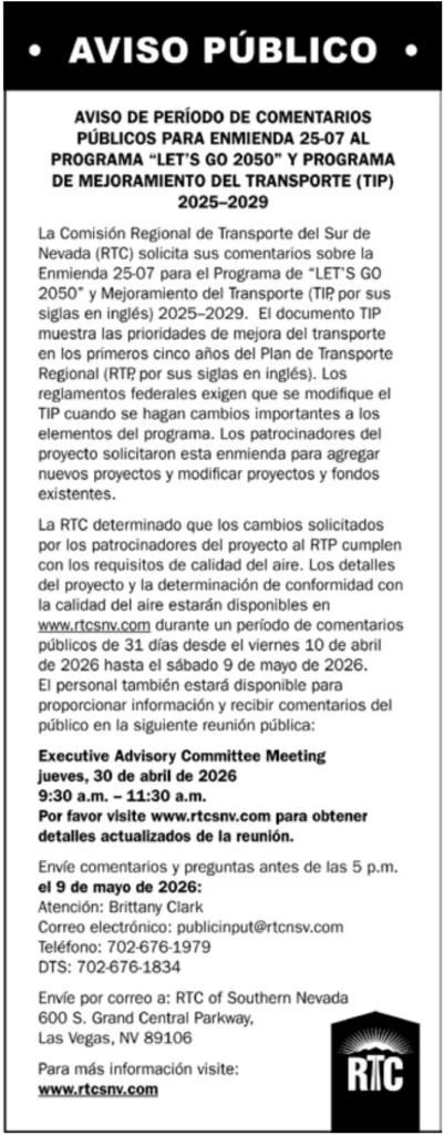 La RTC determinó que los cambios solicitados por los patrocinadores del proyecto al RTP cumplen con los requisitos de calidad del aire. Los detalles del proyecto y la determinación de conformidad con la calidad del aire estarán disponibles en www.rtcsnv.com durante un período de comentarios públicos de 31 días desde el viernes 10 de abril de 2026 hasta el sábado 9 de mayo de 2026. El personal también estará disponible para proporcionar información y recibir comentarios del público en la siguiente reunión pública: