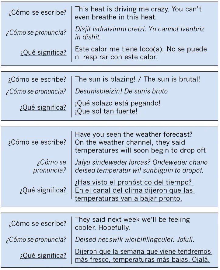 Estas frases le ayudarán a entablar una conversación breve sobre el clima. Varias situaciones nos atañen a todos, entre ellas, cuando tiene que caminar desde o hasta la parada del ómnibus o desde donde dejó estacionado su auto hasta la tienda. También cuando precisa una gestión impostergable y desplazarse sobre el asfalto caliente, le demanda refrescar. Ahí es cuando usted puede utilizar estas frases.