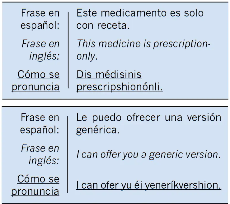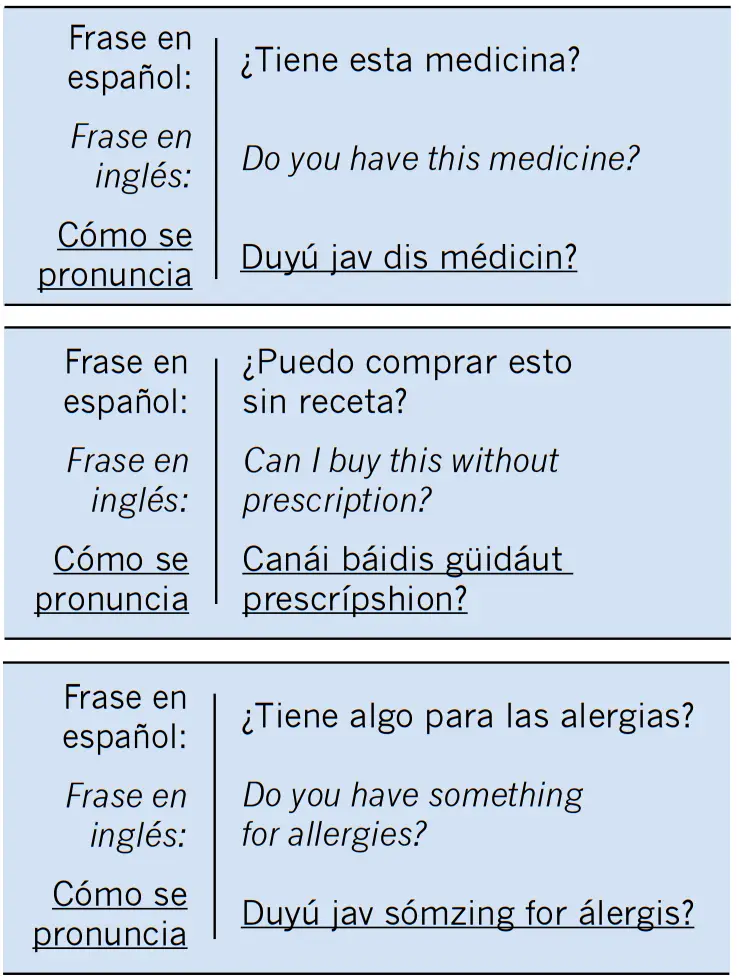 También les escribo algunas frases o preguntas que el farmacéutico puede decirle.