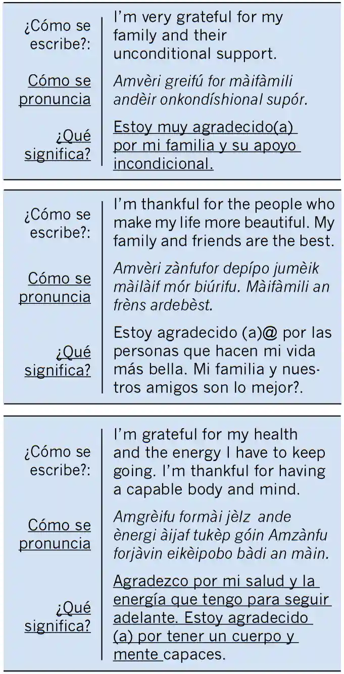 Se acercan días en que algunas personas reflexionan más acerca de la vida y de lo que han logrado con su esfuerzo, paciencia y dedicación. En esta oportunidad les propongo frases que puede emplear en una plática. Recuerde que esta sección es para sugerirle. En modo alguno es una transcripción fonética a nivel académico o lingüístico. Solo elementos básicos que les pueden ser de utilidad.